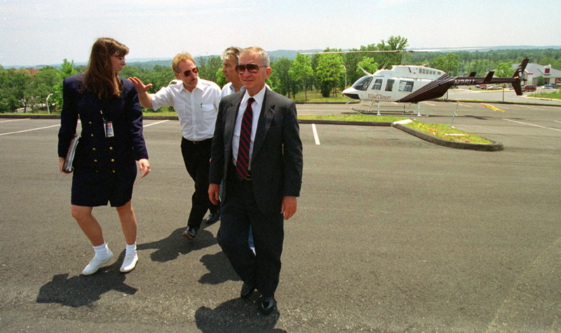 A happy-go-lucky Ross Perot walks from his chartered helicopter at the Grand Palace in Branson, Missouri. Following are Beth Wanser, the pilot and an aid of Perot. (Copyright John S. Stewart/LEFTeyeSTORIES)